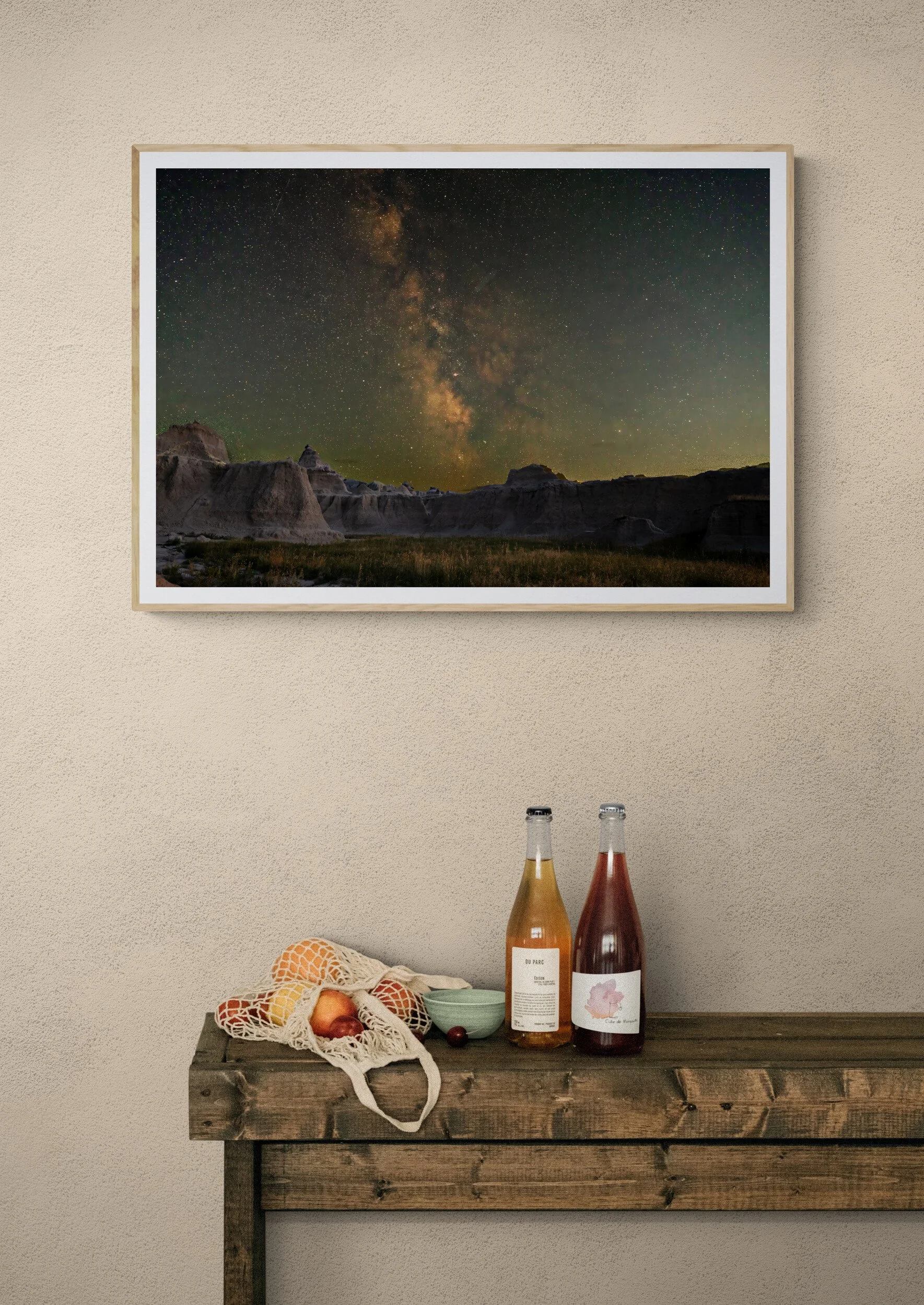 Badlands National Park topography was created by layers of sediment while the land was under water. Those layers are mimicked by the low thin clouds trying to obscure the core of the Milky Way. Purchase Back to Gallery Home